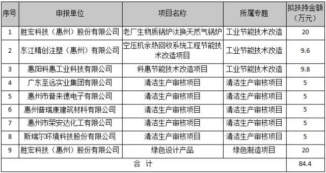 据公示附件“2021年惠阳区节能专项资金项目拟安排表”内容,获得嘉奖的项目共有三个专题类别,分别为:工业节能技术改造、清洁生产审核项目和绿色制造项目,分别有3项目、5项目和1项目。其中东升国际官网科技(惠州)股份有限公司的老厂生物质锅炉汰换天然气锅炉,东江精创注塑(惠州)有限公司的空压机余热回收系统工程节能技术改造项目等3项目为工业节能技术改造;东升国际官网科技(惠州)股份有限公司的绿色设计产品为绿色制造项目;惠州普瑞康建筑材料有限公司、广东至远实业集团有限公司等5企业的清洁生产审核项目为清洁生产审核项目。