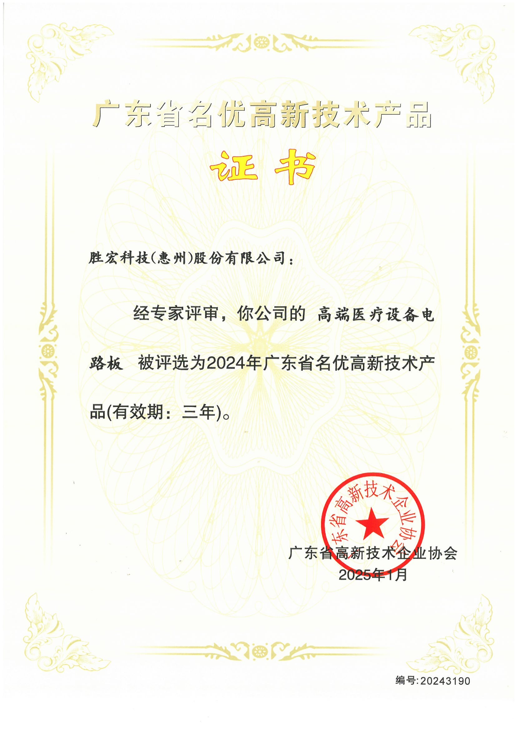 “高端医疗设备电路板”高新技术产品证书